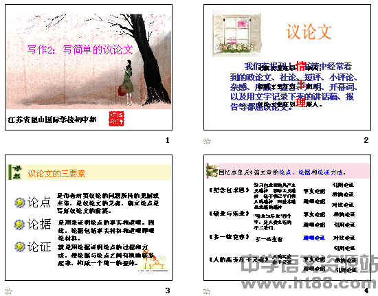 共15张。详细解释了议论文三要素的内涵特点,并有不少的题目演练,帮助初二学生学会写好议论文。